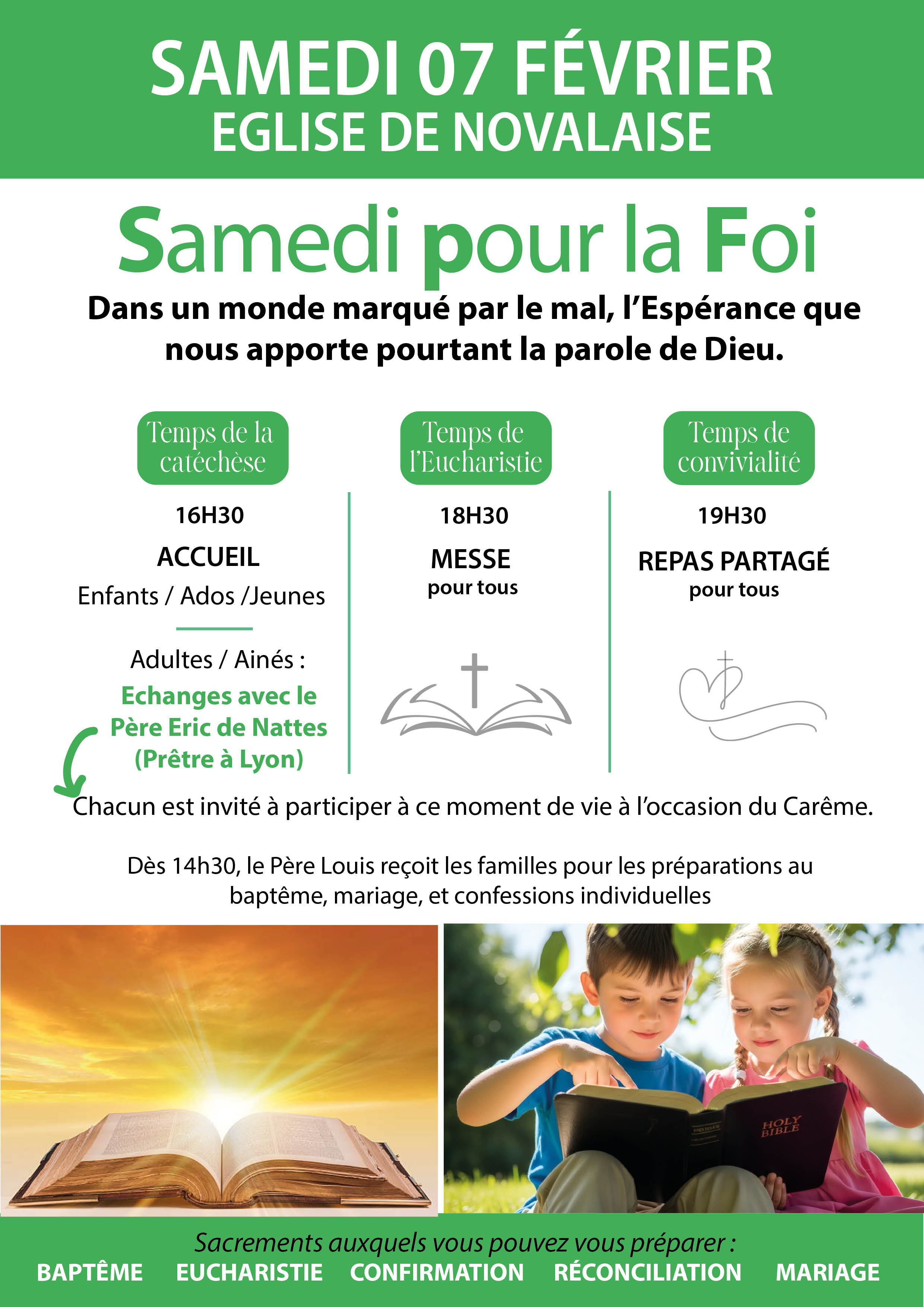 Samedi pour la foi du 7 février 2026 : Catéchèse Accueil : 16h30 Enfants/ados/jeunes Éveil à la foi, caté, aumônerie. Adultes/ainés partage d’Évangile. Échange avec le père Éric de Nattes (prêtre à Lyon) Chacun est invité à participer à ce moment de vie à l’occasion du Carême. Messe pour tous 18h30. Repas partagé 19h30. Pour tous. Dès 14h30, le père Louis Duret reçoit les familles pour les préparations au baptême, mariages et confessions individuelles.